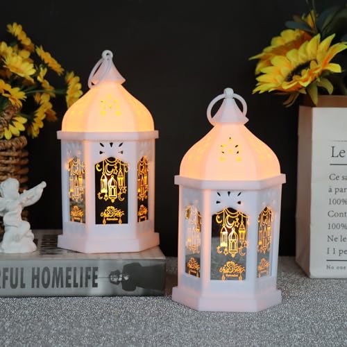 - 🧕[حرفية ممتازة لصنع فوانيس رمضان المثالية] - نقدم قطعتين من فوانيس رمضان البيضاء مقاس 20 × 9 سم مع زخارف إسلامية جميلة مطبوعة بالليزر على كل سطح من الأسطح الزجاجية الستة وضوء أصفر دافئ لخلق جو رمضان غني.