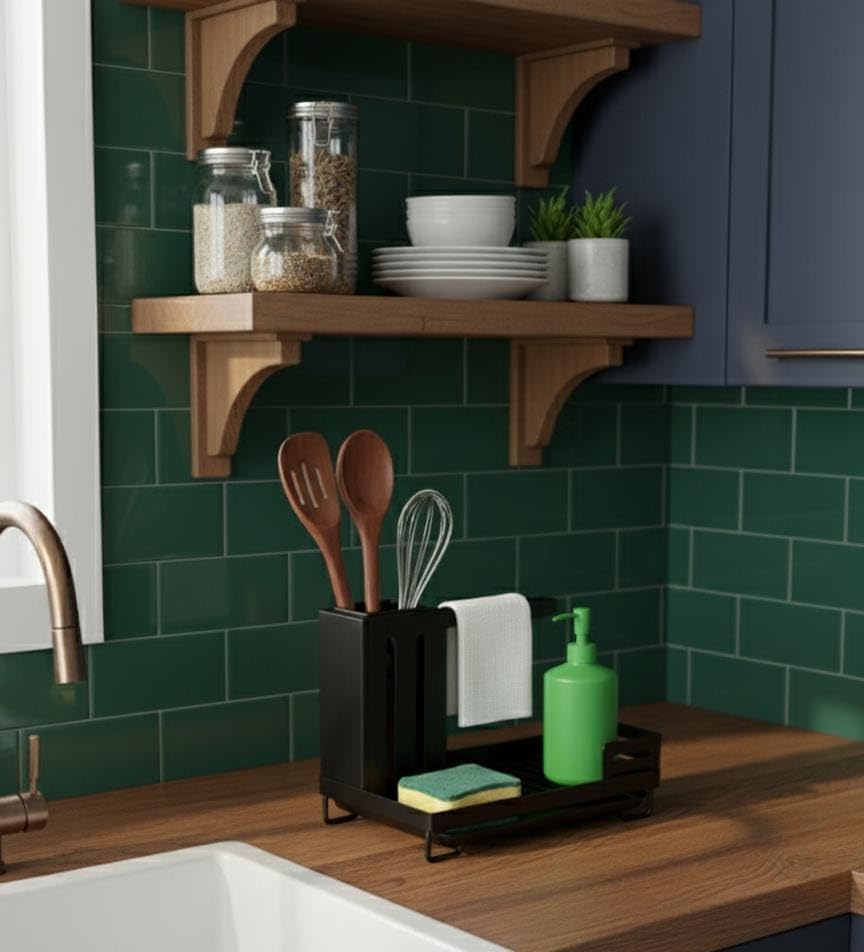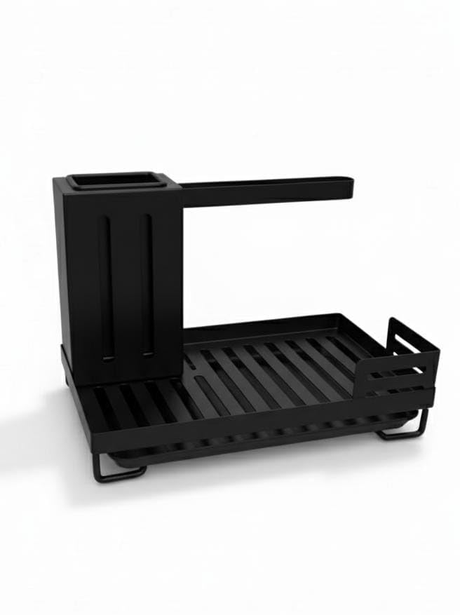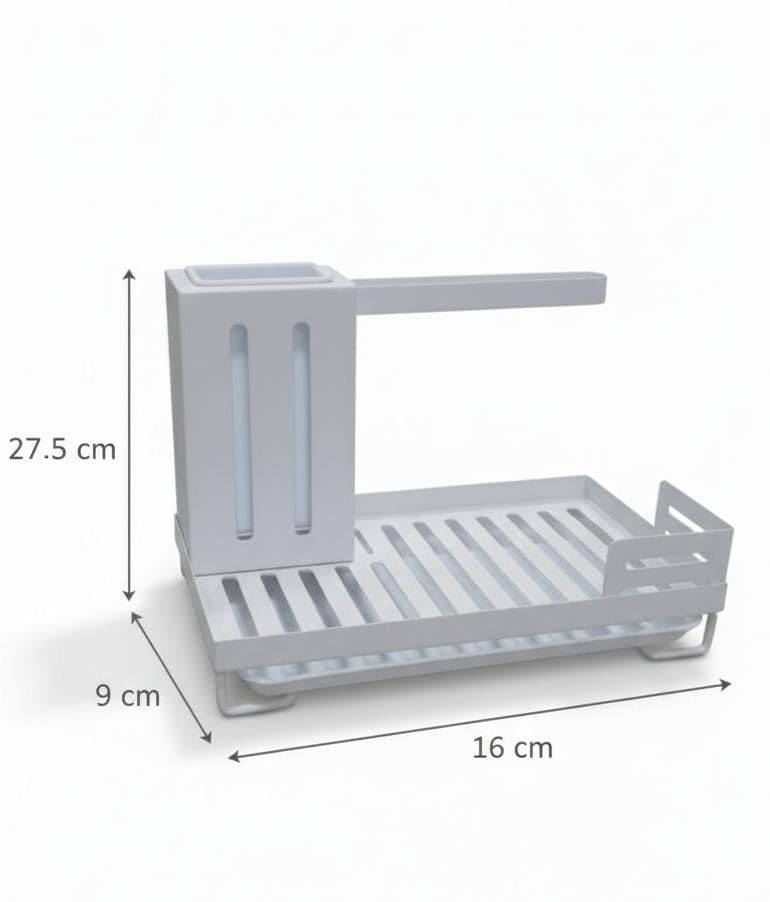 - All-in-One Sink Organizer: Keeps sponges, soap dispenser, brushes, and dishcloth neatly stored by the sink. Draining Design: Features a slotted rack and a removable base tray to catch water, ensuring quick drying and hygiene. Dedicated Tool Compartment: Tall, divided holder is perfect for storing utensils and cleaning brushes upright. Integrated Towel Bar: Includes a horizontal bar for hanging and drying dishcloths or hand towels. Durable & Easy to Clean: Made from sturdy material with a minimalist design that is simple to wipe down