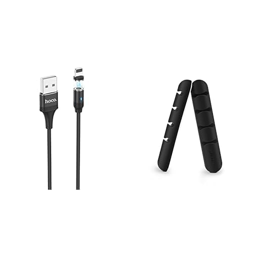 HOCO - مجموعة كابلات اسنشيالز (هوكو U76، كابل شحن مغناطيسي 2 امبير طول 1.2 متر) ومقبس لايتنينج لأجهزة ابل ايفون واي باد وايربودز، أسود + مشابك كابلات من يو جرين لتنظيم الكابلات على المكتب، قطعتان، أسود