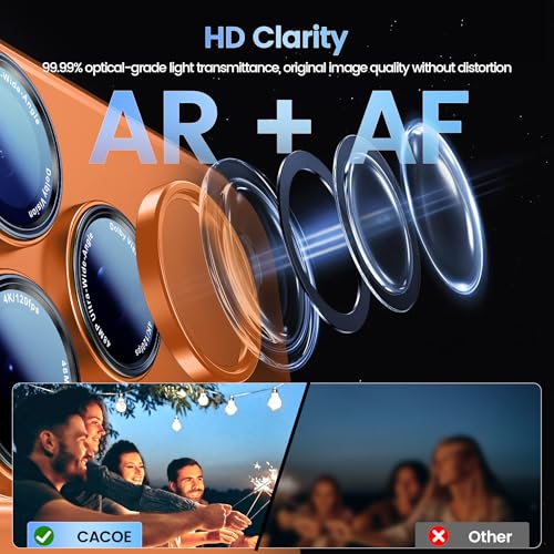 - [Newest Upgraded Protection]: CACOE Camera case for iPhone 17 Pro Max - Metal Aluminum Frame + AF Coating, the 9H tempered glass covering the lens is highly transparent with 99.99% optical-grade light transmittance, HD Clarity Boosted, Scratch/Drop-Proof, All-in-One Durable Shield Design.