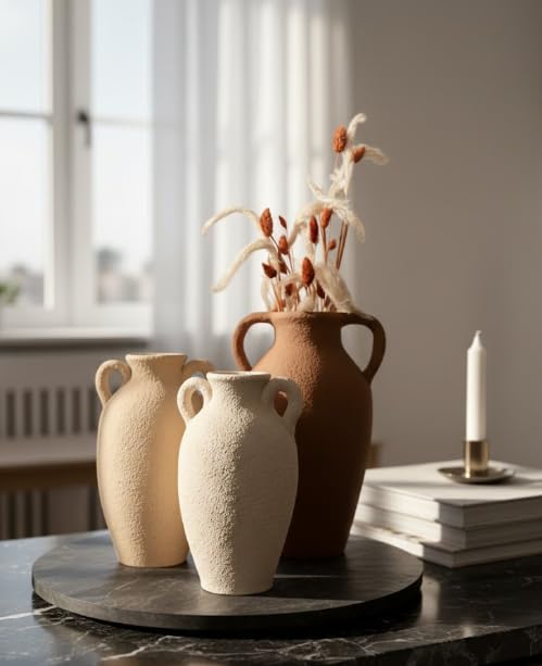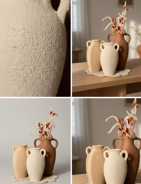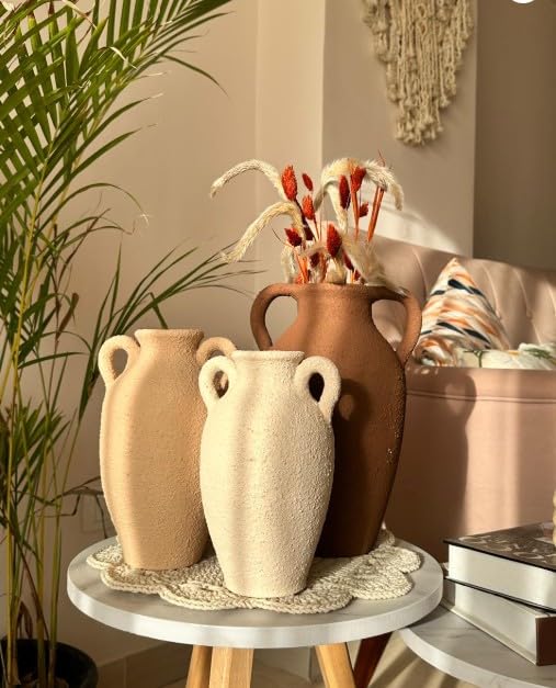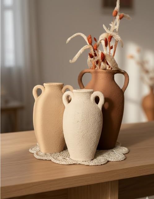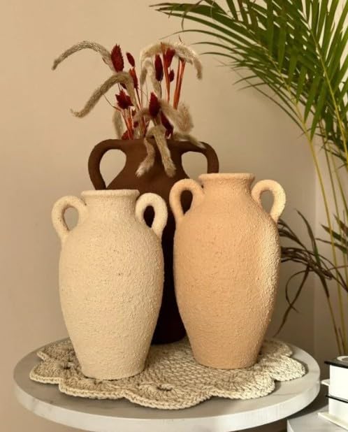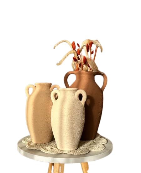 - Premium Natural Clay Construction: Handcrafted from 100% natural clay, this 3-piece pottery vase set showcases authentic artisan craftsmanship with unique textured finishes