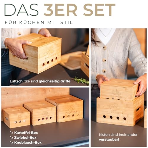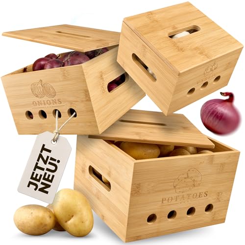 - Robust and stylish - Extra strong (1 cm) bamboo for premium quality. Whether as a potato pot, garlic pot or onion storage box - the durable kitchen organiser set protects your food and serves as a kitchen decoration with style.