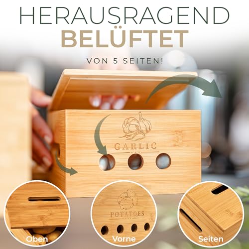- Space-saving & stackable – More order in the home and kitchen: each bamboo box with lid is stackable and easy to clean. The practical potato container for up to 4 kg potatoes, 2 kg onions and 1 kg garlic.