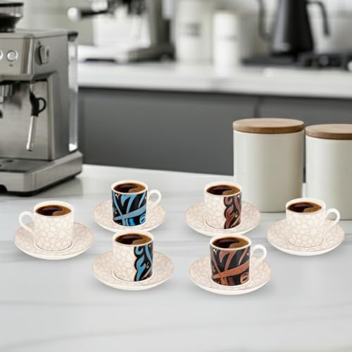 - طقم كامل من 12 قطعة: يحتوي الطقم على 6 أكواب قهوة من البورسلين و6 أطباق فناجين متطابقة، مثالية لتقديم الإسبريسو أو القهوة التركية للأسرة والضيوف.