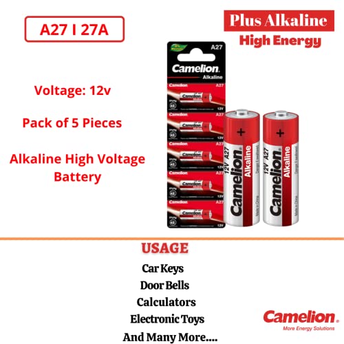 Camelion - بطارية قلوية عالية الجهد 12 فولت لمفاتيح السيارة وأجراس الباب والآلات الحاسبة وغيرها من كاميليون (مجموعة من 5 قطع) - A27