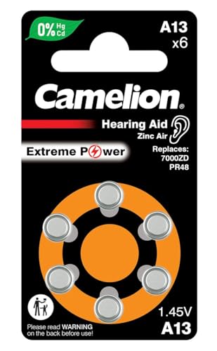 Camelion - Camelion Extreme Power A13 Hearing Aid Batteries – Zinc Air – 1.45V – 250mAh – PR48 – 6 Pack – Mercury-Free & Eco-Friendly