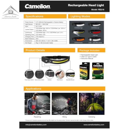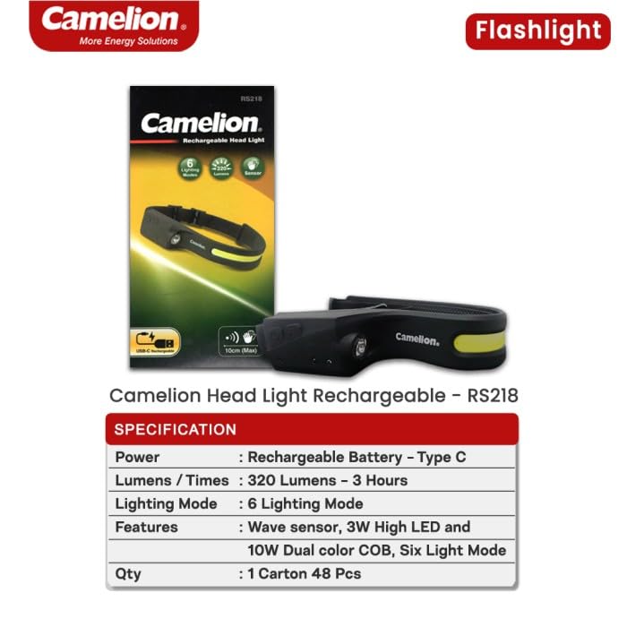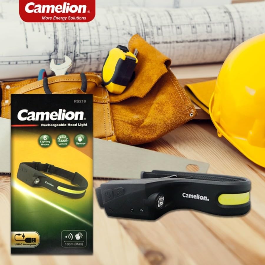 Camelion - Camelion RS218 Rechargeable Headlight – Super Bright COB + LED, Wave Sensor, Type-C USB Charging, Lightweight & Compact