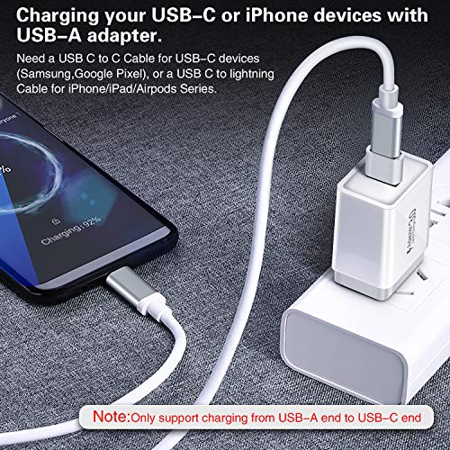 - 【USB A to USB C Adapter】 This USB C female to USB A male adapter provides a hassle-free way of connecting your USB-C peripherals to the devices which having USB-A ports. For example, you can plug the adapter into a USB charger and charging for your iPhone with a USB-C to lightning cable, or charging Samsung/Google phones with a USB C to C cable; you can also use it to transfer images/music between your laptop and USB-C disk/hard drives.