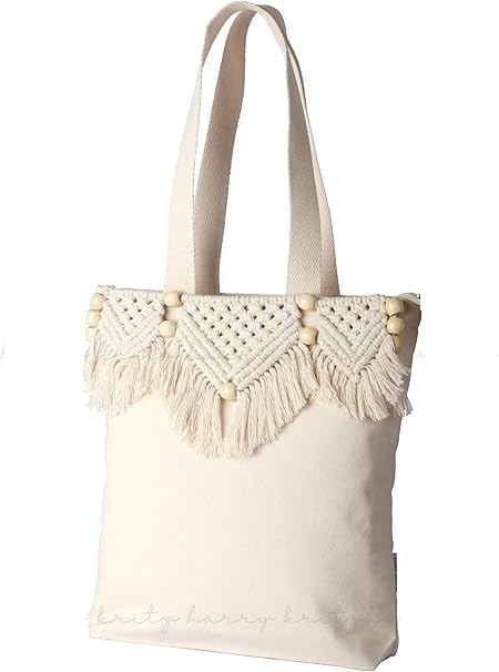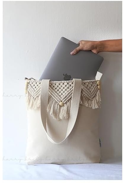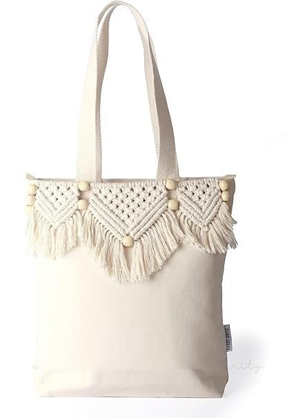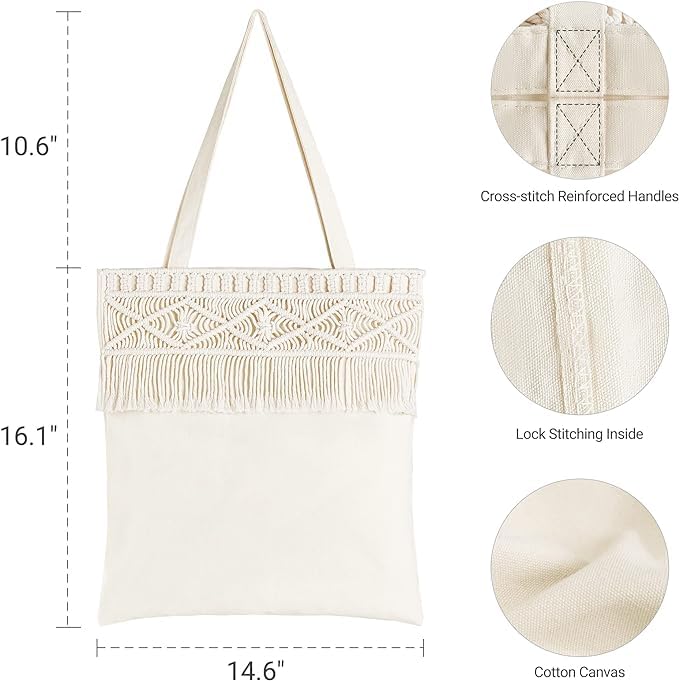 Generic - Canvas Tote Bag for Women, Boho Aesthetic Shoulder Bag with Tassels Macrame Cotton Bohemian Everyday Bag Lightweight Unique Cute for Work Beach Travel Vacation