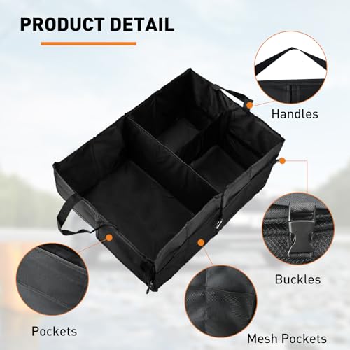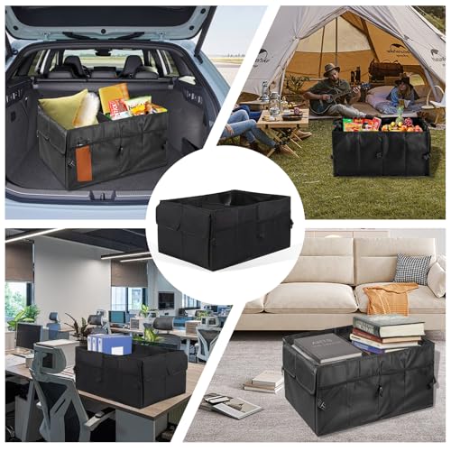 - 【Widely Application】Black foldable car accessories bag is suitable for organizing groceries, tools, and camping supplies. Multi-compartment collapsible organiser is also perfect for picnics, road trips, and everyday car use.
