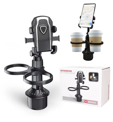AUGIGKO - حامل جوال للسيارة مع 2 حامل اكواب للسيارة، حامل موبايل عالمي للسيارة - اذرع وزوايا بمشبك قابل للتعديل، حامل جوال 2 في 1 مناسب لجميع الهواتف الذكية ومعظم الزجاجات
