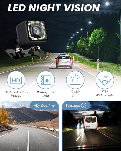 GBULTR - كاميرا خلفية للسيارة بدقة 1080P وزاوية واسعة 170° مع 12 لمبة ليد، رؤية ليلية، مقاومة للماء IP68، كاميرا عكسية لمختلف السيارات مع اتصال 12-24 فولت