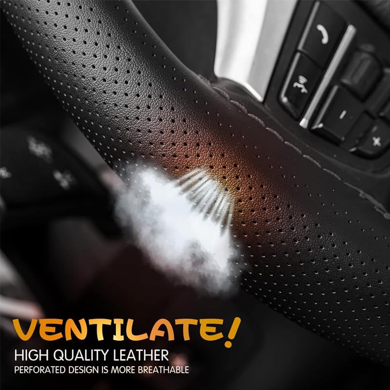 - ✅قبضة وأمان معززين: يوفر الجلد عالي الجودة قبضة أفضل، مما يزيد من سلامة القيادة. انس الانزلاق والتحكم في سيارتك بثقة.