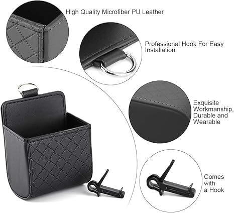 Generic - هولدر تخزين جلد منظمة للتعليق بخطاف في فتحة تهوية السيارة تستخدم كحامل موبايل وجيب لتعليق النظارة الشمسية والمفاتيح والعملات المعدنية والبطاقات ( اسود - قطعة واحدة )