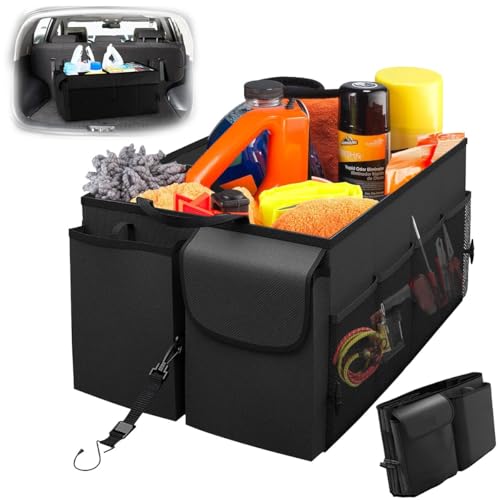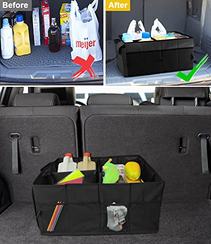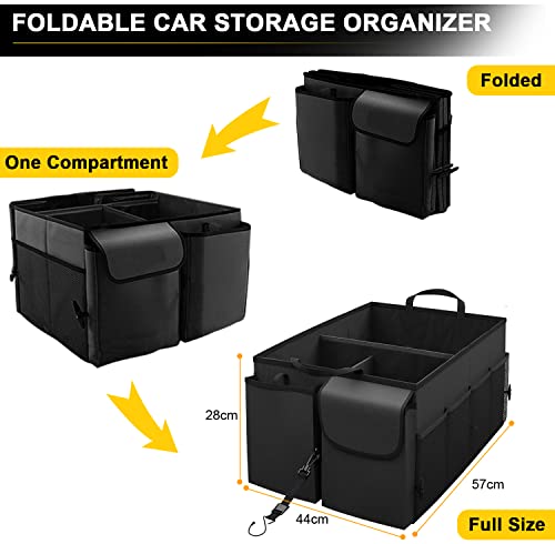 - 【Large Capacity】: This car trunk organizer has super larger capacity, which is 57cm x 44cm x 28cm(L x W x H) and is up to 70L large capacity. 3 compartments of our cargo storage box make easier organize and categorize your food, bottles, books, tools, etc. Whatever you put how many things in the spacing saver, storage space is completely sufficient.
