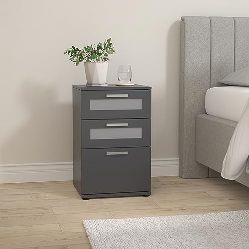 - The bedside cabinet is made of high-quality chipboard in E1 quality and coated in grey melamine resin. The surface is easy to clean and protected from scratches