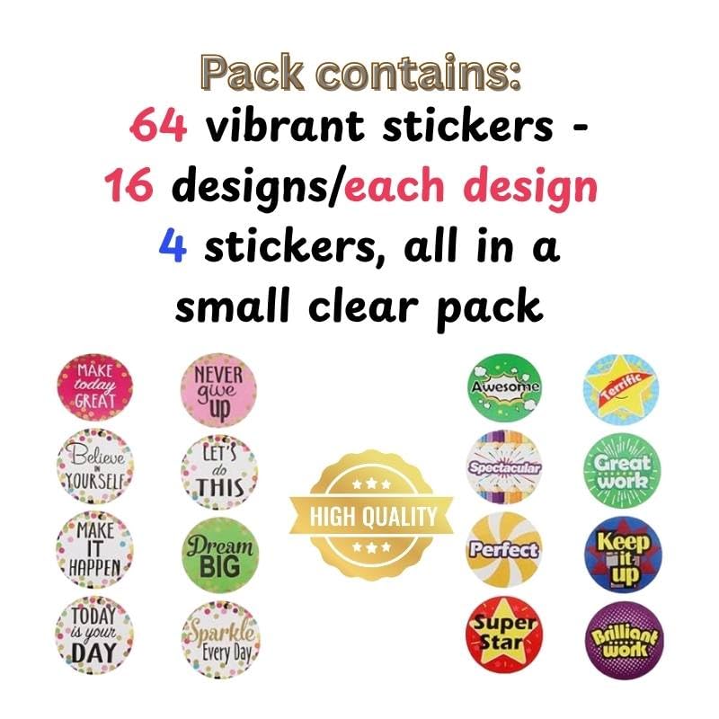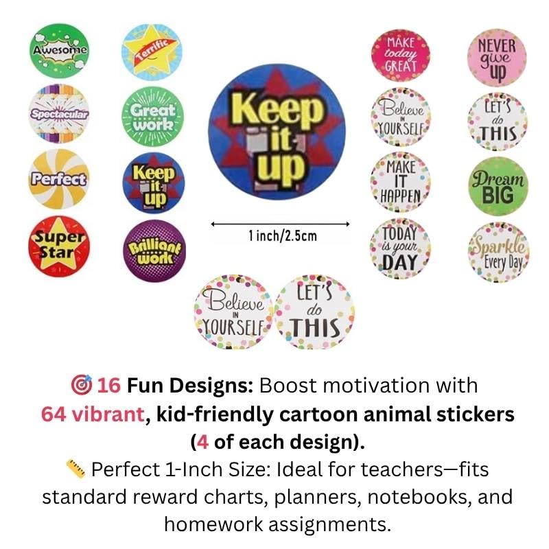 - 🎯 16 Fun Designs: Boost motivation with 64 vibrant, kid-friendly motivation stickers (4 of each design). 📏 Perfect 1-Inch Size: Ideal for teachers—fits standard reward charts, planners, notebooks, and homework assignments.