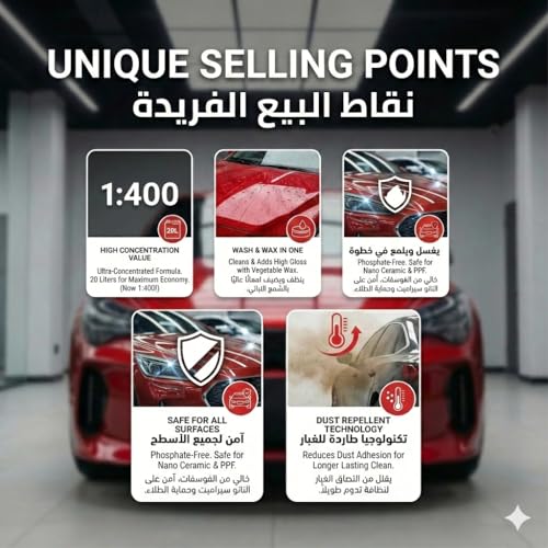 - 1:400 تركيز فائق: تركيبة عالية الكفاءة تسمح بالتخفيف الشديد (1 لتر من المنتج إلى 100 لتر من الماء)، مما يجعل هذا الجيري سعة 5 لتر خيارًا اقتصاديًا للتفاصيل الاحترافية أو الاستخدام الشخصي طويل الأمد. يتغلغل في الأوساخ الصعبة دون إتلاف الطلاء. (شامبو مركز للغاية).