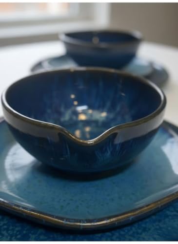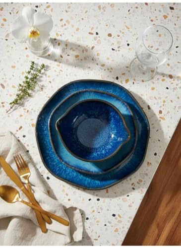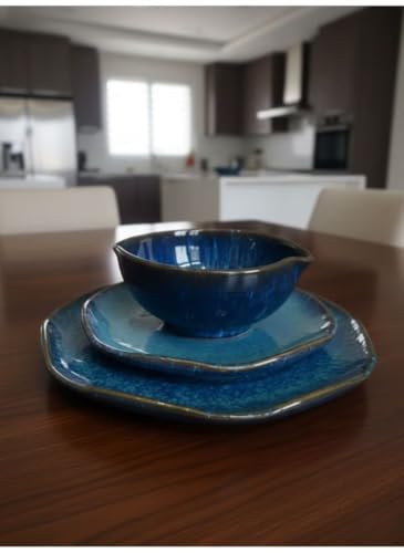 Generic - CasaHome Dinnerware Set 3-Piece with Pour-Spout Bowl & Organic-Edge Plates, Deep Ocean Blue Reactive Glaze – Elegant Dining & Serving
