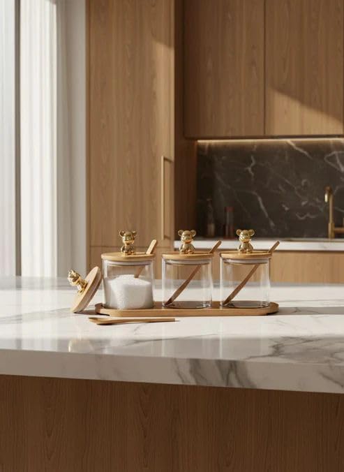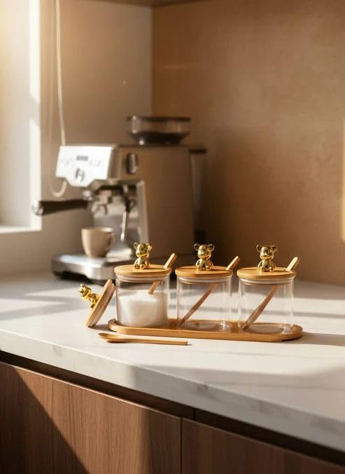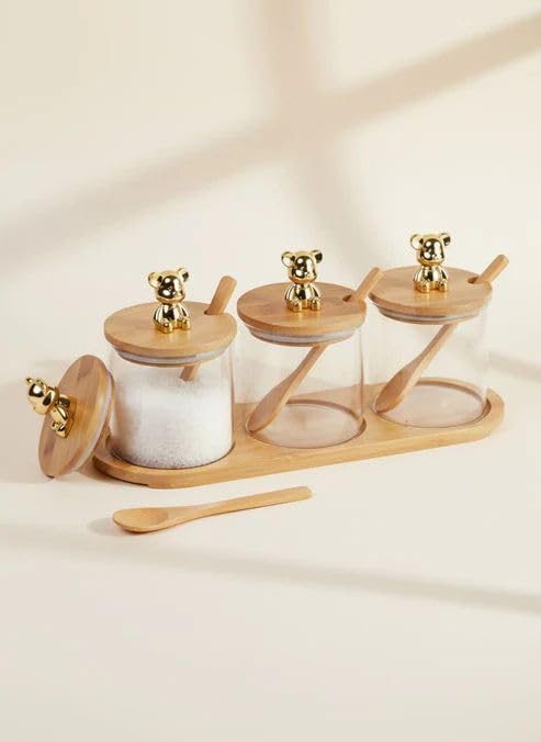 Generic - CasaHome Glass Spice Jar Set – 3-Piece with Bamboo Lids, Gold Bear Knobs, Matching Spoons & Bamboo Tray, Natural Bamboo/Gold – Modern Condiment Organizer