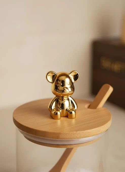 - Elegant trio: clear glass jars with bamboo lids and gold-tone bear knobs.