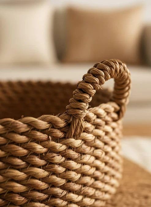- Premium handwoven natural-fiber basket adds organic warmth and texture to any room.