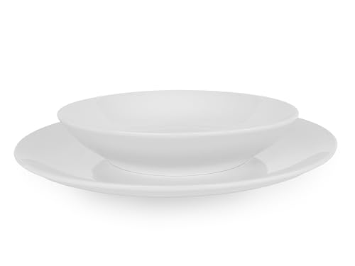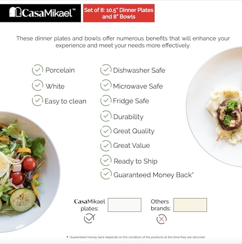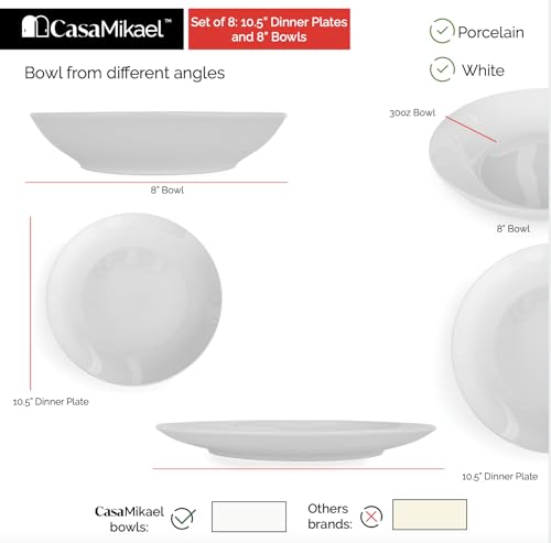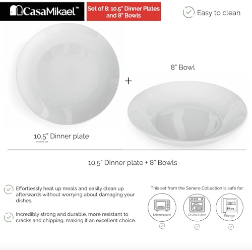 CasaMikael - SET OF 8 – 10.5" DINNER PLATES + 8″ WHITE PORCELAIN BOWLS – SERENO COLLECTION
