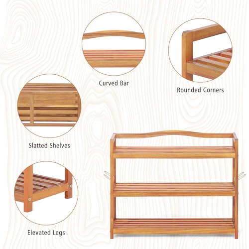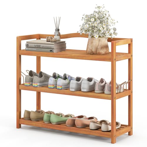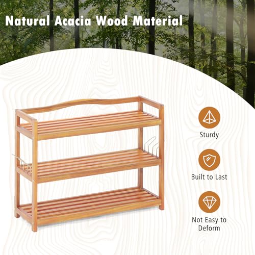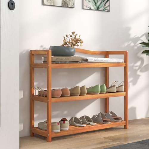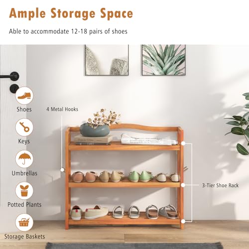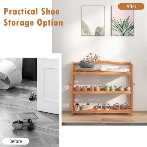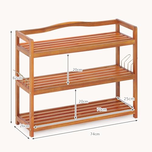 CASART - CASART 2/3/5 Tiers Shoe Rack, Solid Wood Shoes Shelves with Metal Hooks, Durable Entryway Standing Shoe Rack Shoes Storage Organizer for Hallway Living Room Closet (3-Tier: 74 x 26 x 62cm)