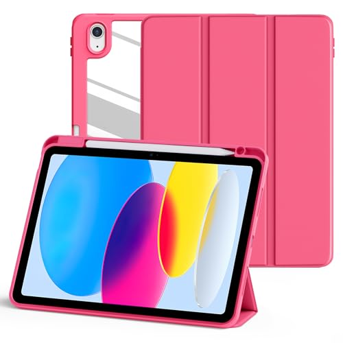 SANDUODD - Case for 10.9 inch iPad 10th Generation 2022 with Pencil Holder, Clear Acrylic Back with Shockproof TPU Frame and Soft Tri-fold Stand PU Cover for New iPad 10th Gen 2022 (Watermelon Red)