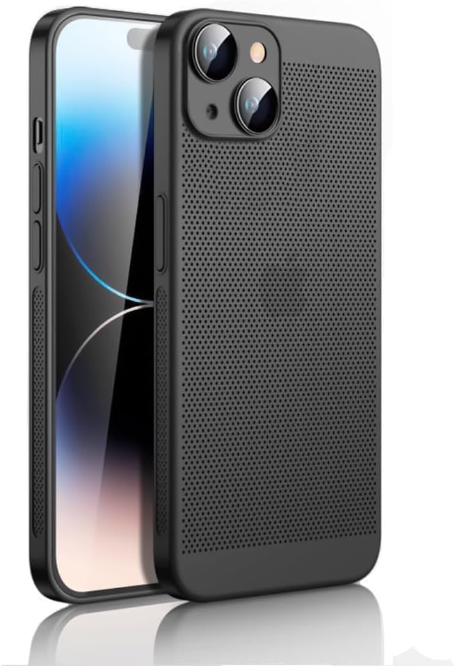 ELMO3EZZ - جراب خلفي صلب من البولي كربونات لتبديد الحرارة مع واقي عدسة كاميرا مدمج بتصميم رفيع ومزود بمسامات للتهوية ومضاد للبصمات والصدمات لموبايل آيفون 15 بلس 6.7 بوصة، أسود