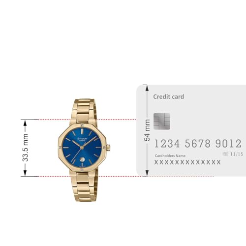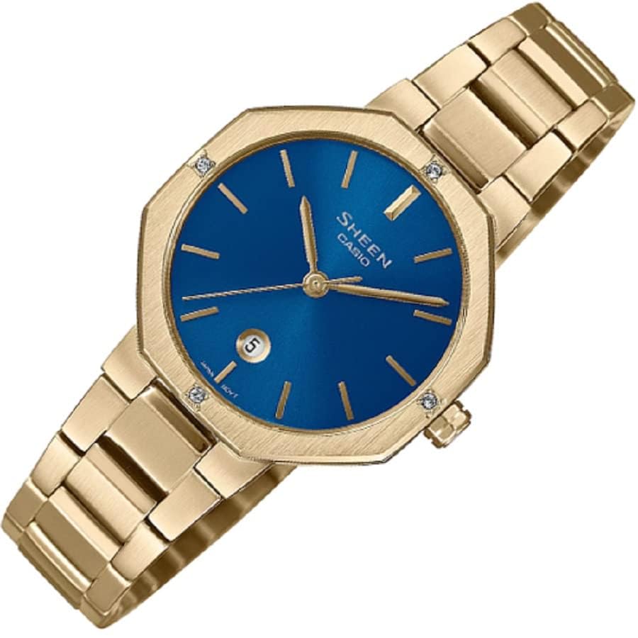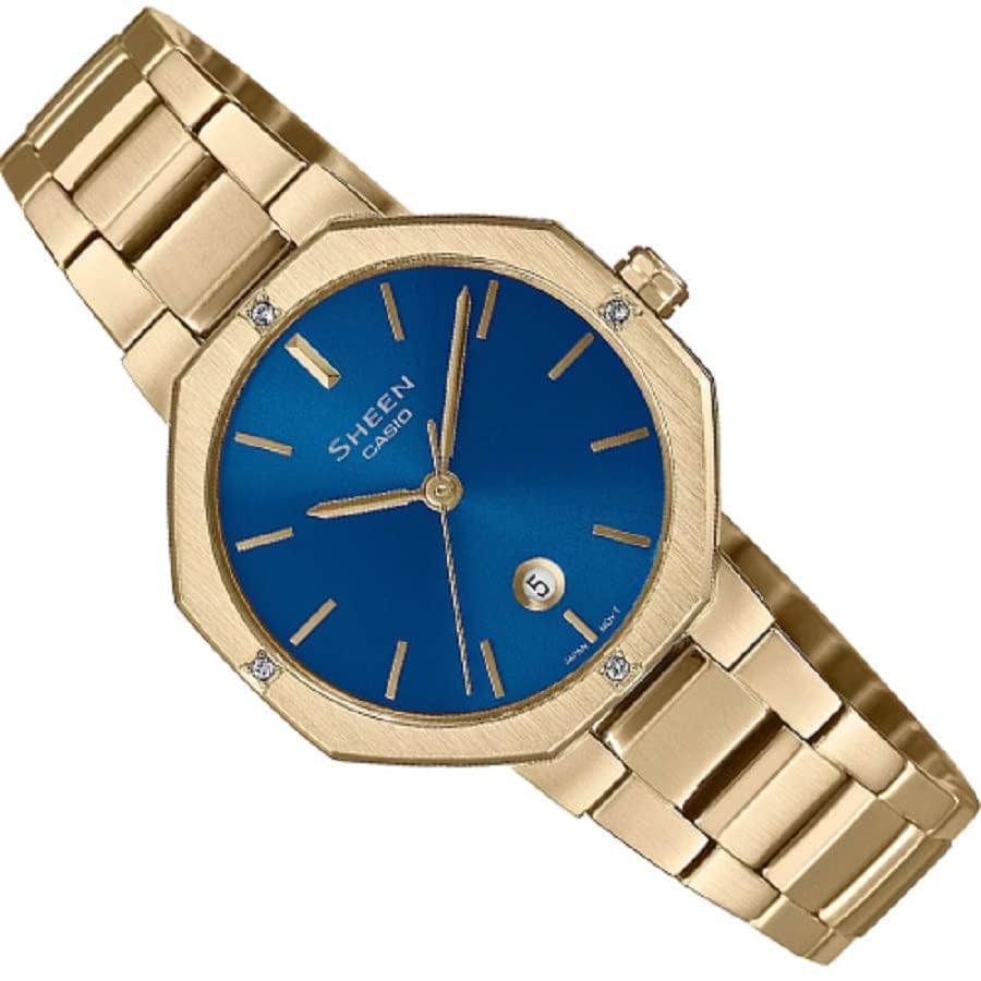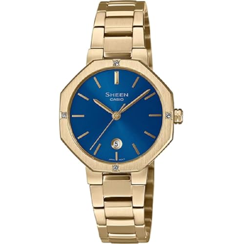 Casio - ساعة يد انالوج بوجه ثماني الأضلاع وخاصية عرض التاريخ ومينا بلون أزرق وسوار من الفولاذ المقاوم للصدأ للنساء من كاسيو، موديل SHE-4543G-2AUDF