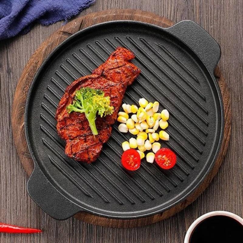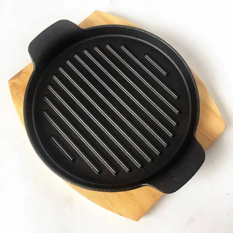 Generic - Cast Iron Sizzler Plate with Wooden Base, 22.5 cm Round Grill Pan, Heat Retaining Serving Platter (size25)