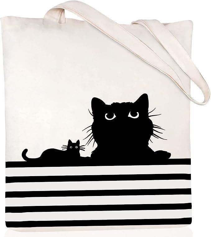 Generic - شنطة يد كبيرة توت قماشية بتصميم قطة مخططة باللونين الاسود والابيض مع قطط تنظر من القطن الطبيعي بمقابض طويلة
