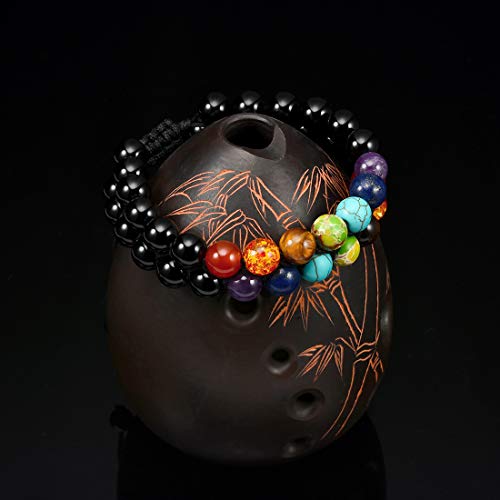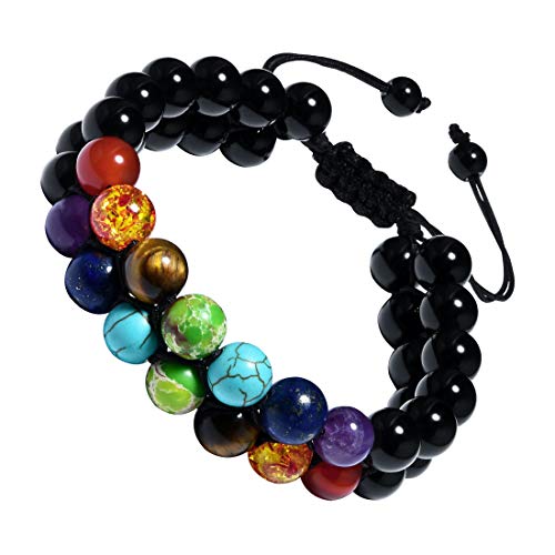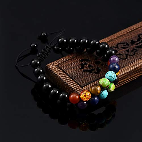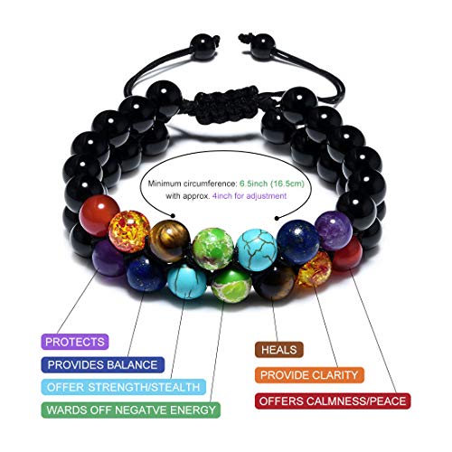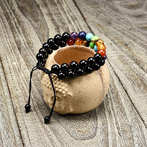 Cat Eye Jewels - Mens Chakra Bracelet 8mm Double Layer Black Agate Bracelet Energy Healing Stone Beads Adjustable Beaded Bracelets for Men Women Boys B001