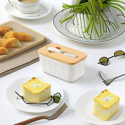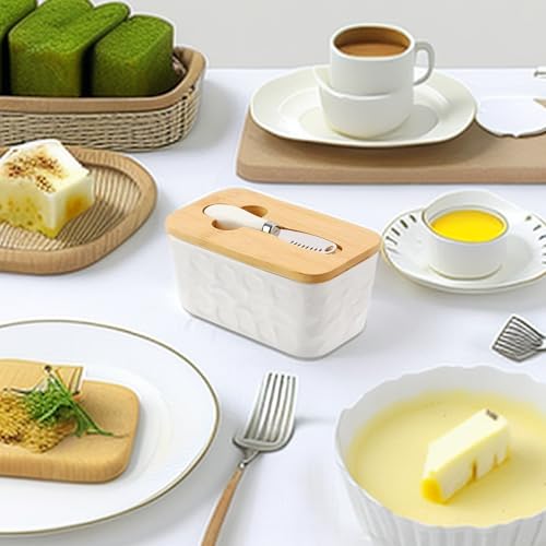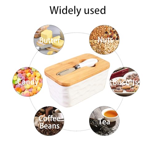 - 【Ceramic Glass Butter Dish with Bamboo Lid】 The fridge cheese bowl is equipped with a versatile butter knife that can be stored in a groove of the wooden lid. The exquisite butter knife fits perfectly on the wooden lid. You can use the wooden lid as a cutting board, use the butter knife to slice, scrape, spread, very convenient and saving space and time.