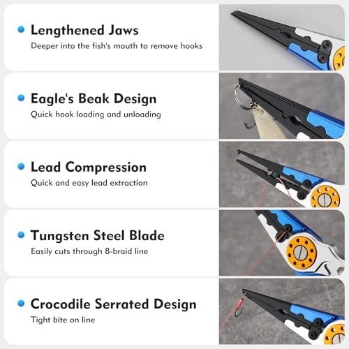 - FEATURED FISHING JAWS - Stainless steel jaws add a small hook at the top for opening stubborn split rings, which can help you to fix lures. The serrated jaws can grab and remove any hook, and the slim jaws allow you to reach deep into the mouth of the fish to remove the hook.