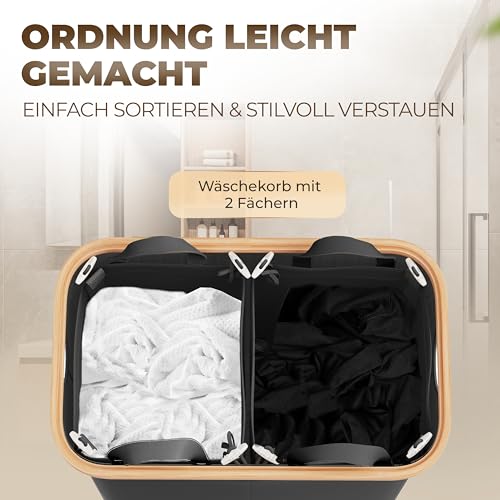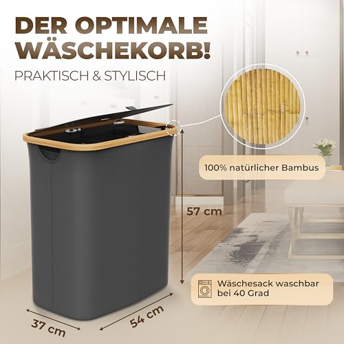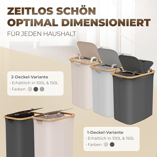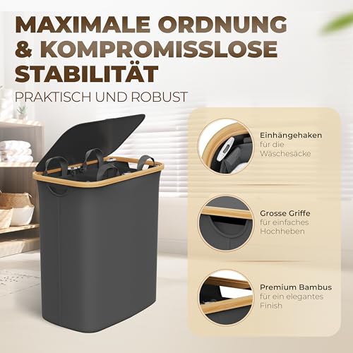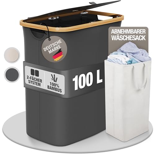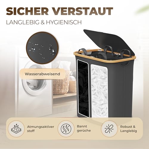 Celeko Home - Laundry Basket 2 Compartments with 1 Lid 100 Litres Bamboo Fabric Grey Large Laundry Sorter Laundry Bin with Lid Laundry Basket Bin Dark Grey Anthracite Black Laundry Hamper | Dark