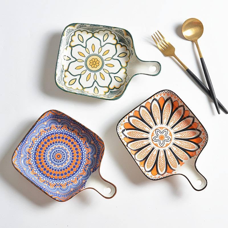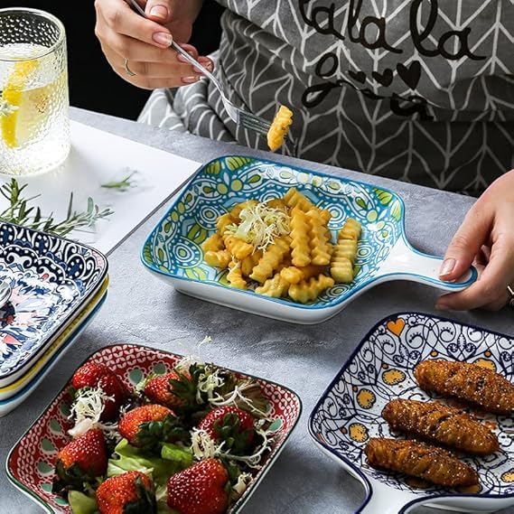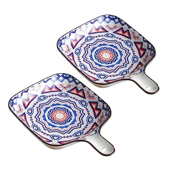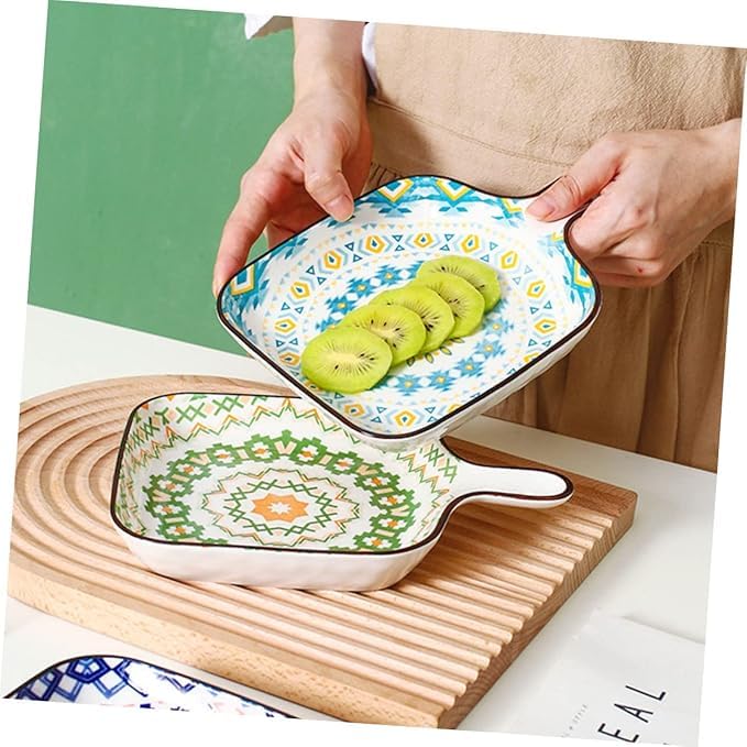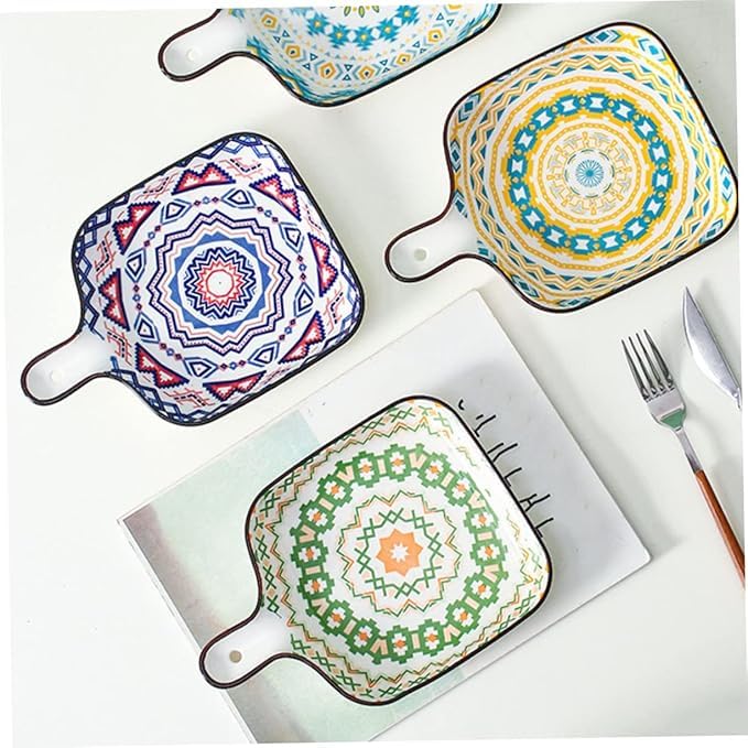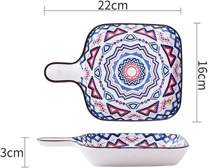 Generic - طبق خبز سيراميك مع مقابض، نمط بوهيمي، طبق تقديم عشاء مربع متعدد الالوان نابض بالحياة لشرائح اللحم والباستا - 4 الوان (قطعتان)