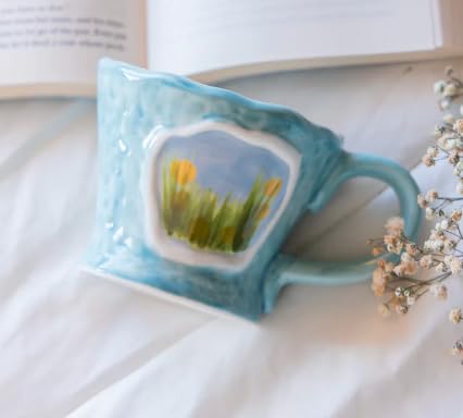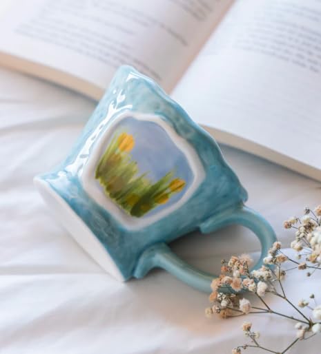 - HANDCRAFTED CERAMIC DESIGN: Artistically crafted ceramic mug featuring a unique turquoise blue glaze with hand-painted landscape artwork, making each piece one-of-a-kind