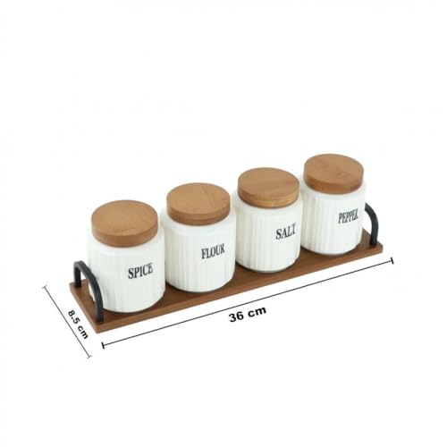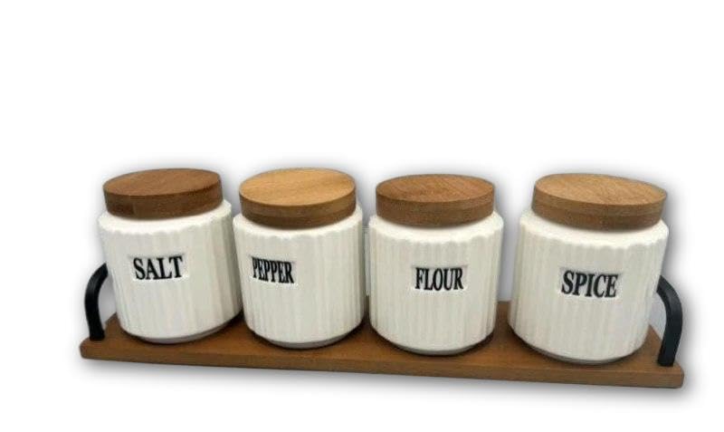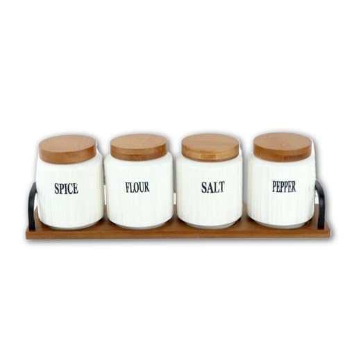 Generic - Ceramic Storage - Farmhouse Style Canister Set with Bamboo Lids, Includes 4 White Jars on a Wooden Tray for Spice, Salt, Flour, Pepper, Kitchen Organization