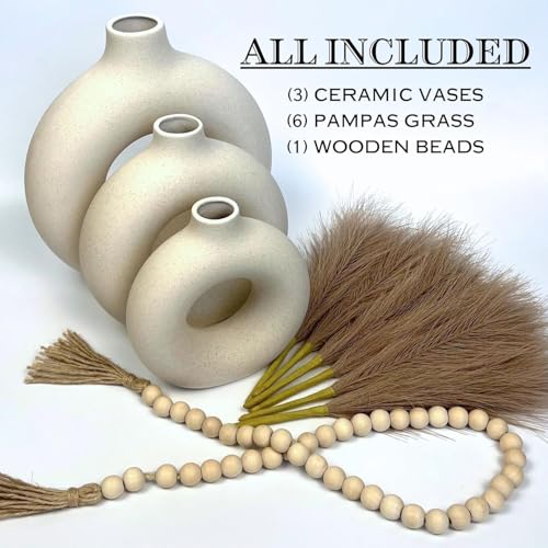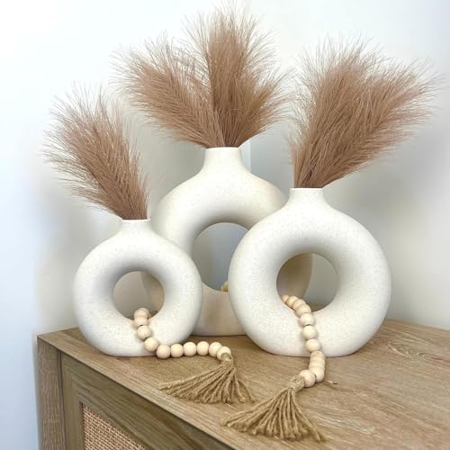 Generic - مزهريات سيراميك لديكور المنزل، مجموعة من 3 قطع - مزهرية دائرية بيضاء عصرية على شكل دونات لزهور البامباس الصناعية، ديكور بوهو لغرفة المعيشة، قطعة مركزية لتزيين رف الطعام (3، ابيض)