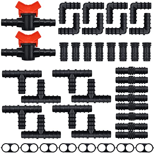CGCD - 42 Pcs Drip Irrigation Fittings Kit 1/2 Inch Tubing Set Irrigation Barbed Connectors Including 2 Switch Valves,8 Couplings,8 Tees,8 Elbows,8 End Closures,8 End Cap for Drip Sprinkler System