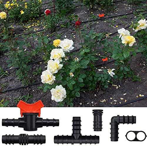 - THE PACKAGE INCLUDES: A total of 42 pieces drip irrigation tubing connectors, including 2 pieces on-off valves, 8 pieces joints, 8 pieces tees, 8 pieces elbows, 8 pieces end closures, 8 pieces end caps, a set of drip irrigation accessories to meet most needs for connecting 1/2 inch irrigation tubing.