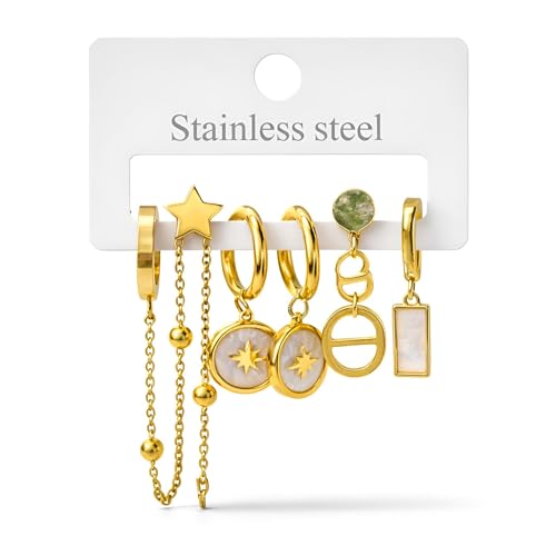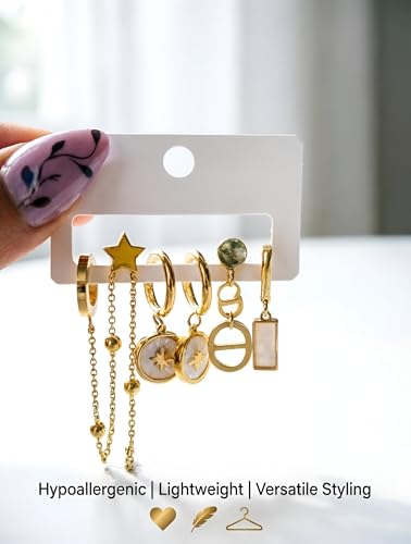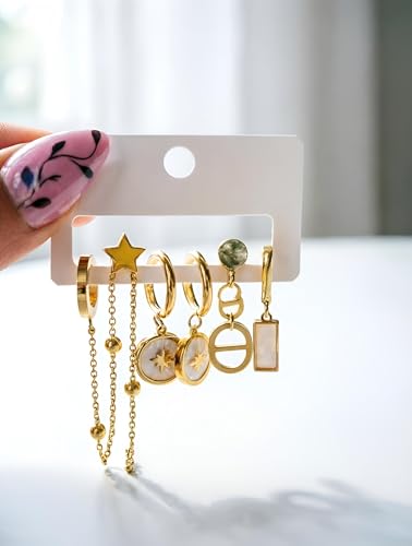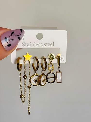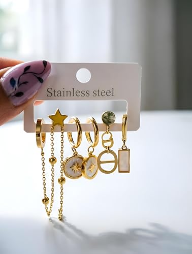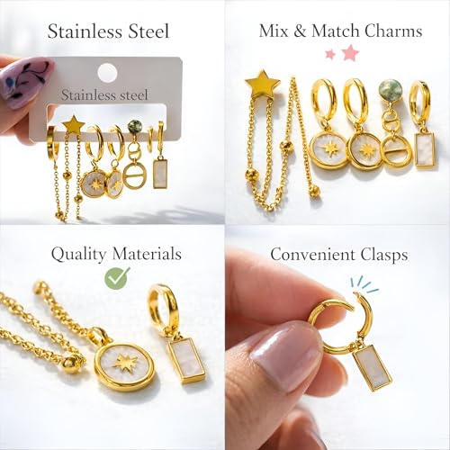 Generic - Chain Links - Mixed style stainless steel gold dangle hoop earrings set featuring star, moon and heart pendants designed for elegant casual daily outfit