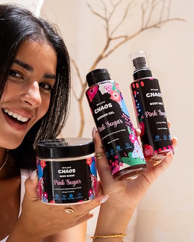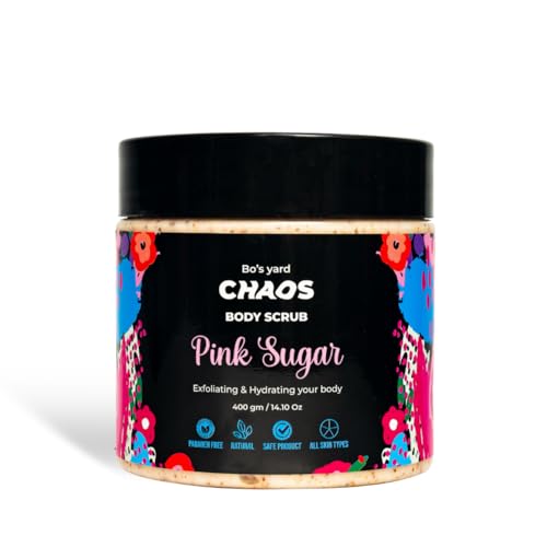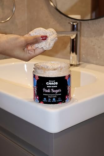 Chaos - مقشر الجسم (سكراب) بنكهة سكرية وردية من ماركة كايوس، مقشر طبيعي بمسحوق بذور المشمش وتركيبة مرطبة (تحتوي على زبدة الشيا وزيت جوز الهند وزبدة الكاكاو)، برائحة سكرية وردية شهية، 400 جم