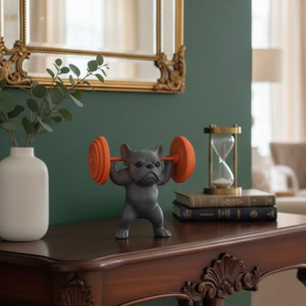 - UNIQUE DESIGN: Adorable French Bulldog figurine lifting weights, crafted with meticulous attention to detail in grey finish with orange weights, perfect for home décor