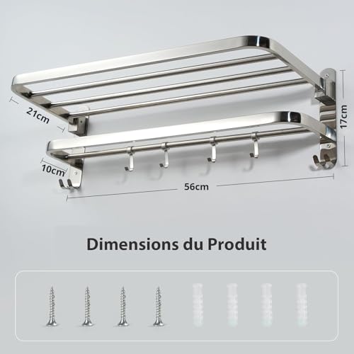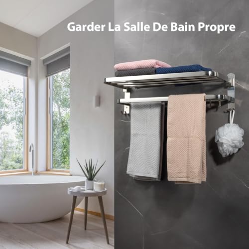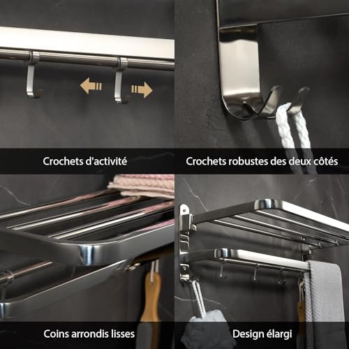 - استخدام واسع: يمكن لقضيب المناشف مزدوج الطبقات مع رف 6 مسارات و9 خطافات إضافية تعليق أكثر من 3 مناشف، والتي يمكن استخدامها لتعليق أدوات الحمام والمطبخ، كرفوف ومنظمات لمطبخ الاستحمام. يمكن استخدامها على جدار الحمام أو الدش أو المطبخ لحمل مناشف الشاي أو تنظيم أدوات الطبخ لتوفير المساحة وتنظيم غرفتك بشكل أنيق.