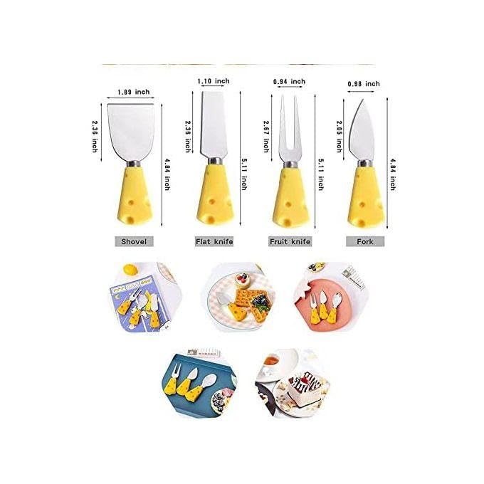 - This 4-piece cheese knife set features uniquely designed yellow handles shaped like Swiss cheese with realistic holes, offering both visual charm and an ergonomic grip that enhances control during slicing and spreading, making it ideal for cheese boards and everyday use.