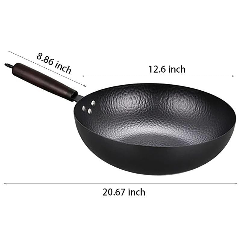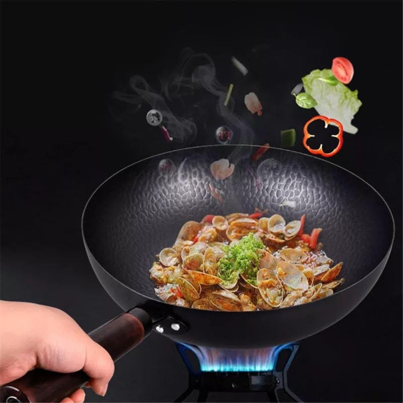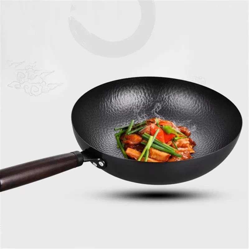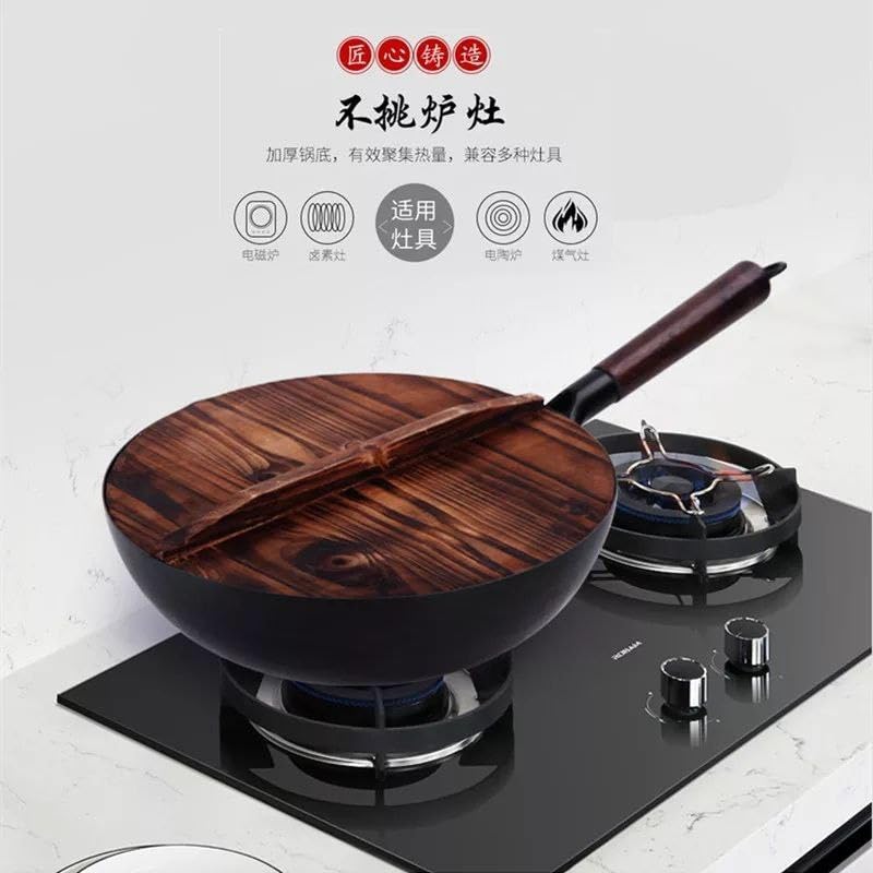 Generic - مقلاة صينية تقليدية مصنوعة بالكامل من الحديد مزودة بيد و غطاء من خشب