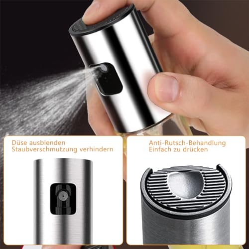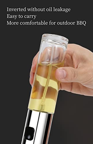 - Oil sprayer for cooking: it is made of high quality stainless steel and LED free glass, BPA free and environmentally friendly, 100% food safety grade. Unique design allows the oil dressing or vinegar to spray balanced on the food, save oil and control the dosage strictly and good for your health and diet.